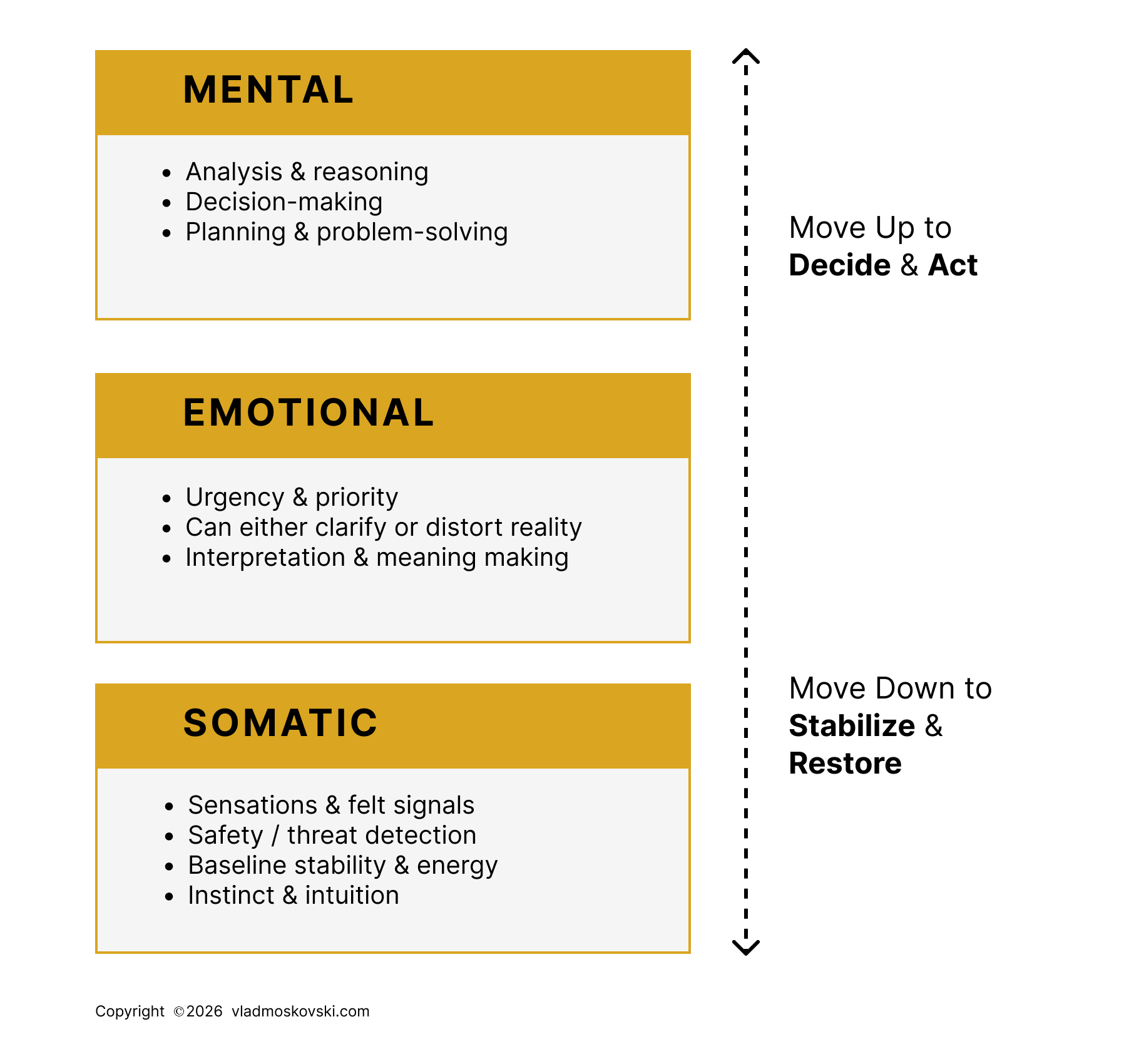 Under pressure, access to the mental layer degrades first. Capacity must be restored from the somatic layer.