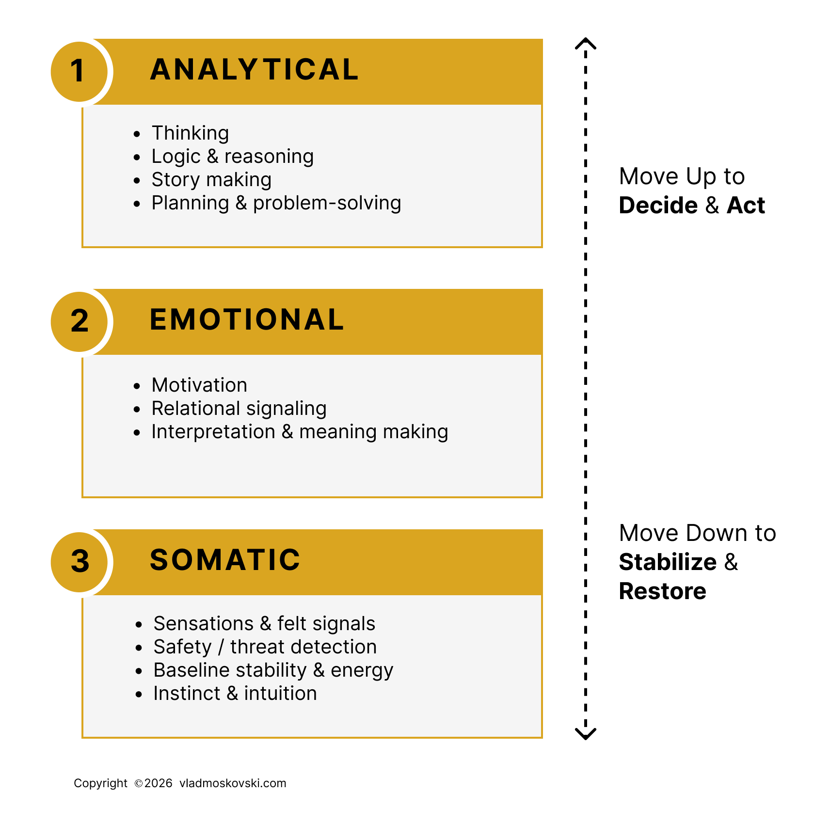 To do this, we must develop the ability to move fluidly between The Three Layers of Awareness: analytical, emotional, and somatic.